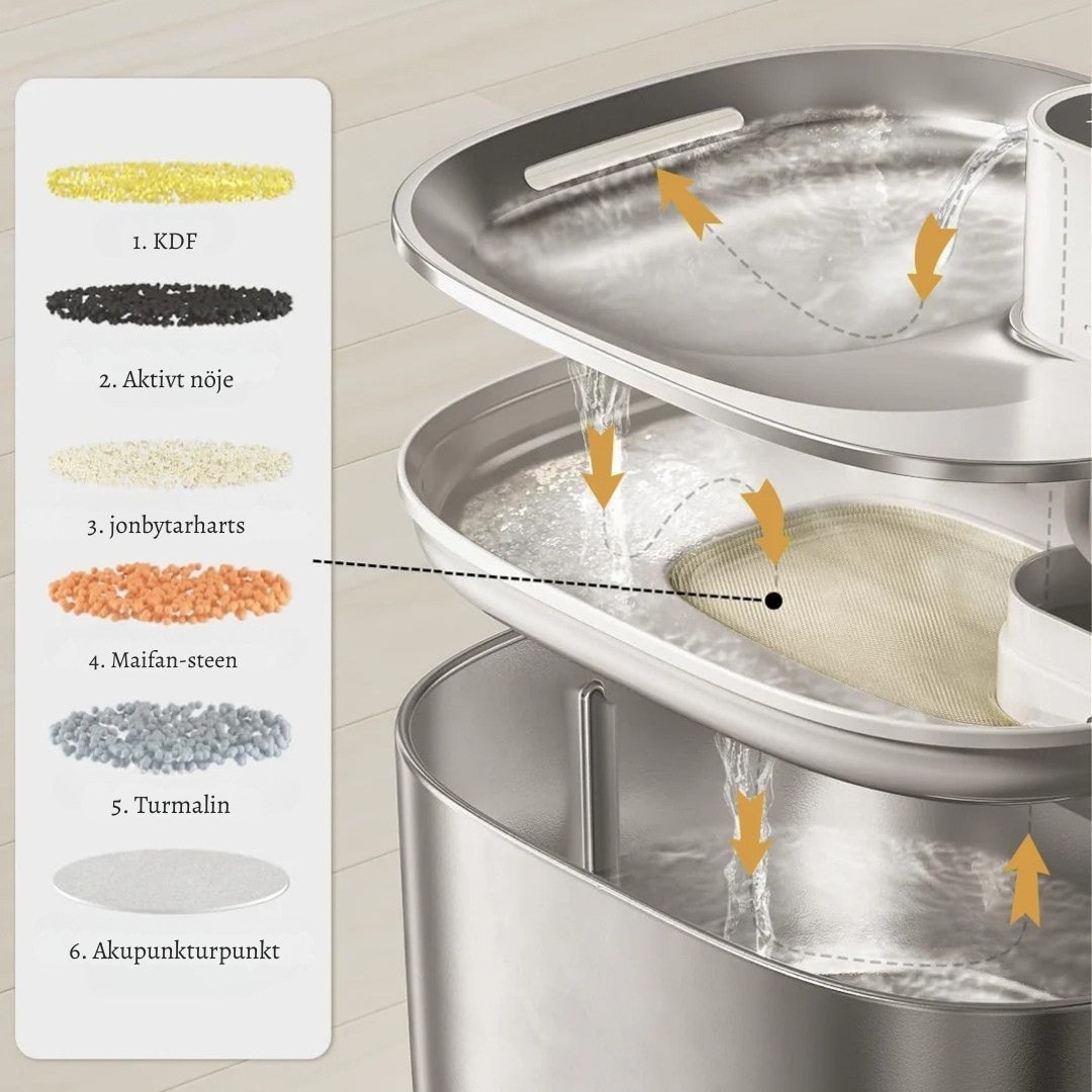 Vätskebalans är avgörande för en frisk katt. Genom att erbjuda filtrerat, rinnande vatten stimulerar du din katt att dricka mer och minskar risken för hälsoproblem. Med en kapacitet på 4 liter finns alltid tillräckligt med vatten – perfekt för upptagna ägare som vill ge sin katt den bästa omsorgen.
